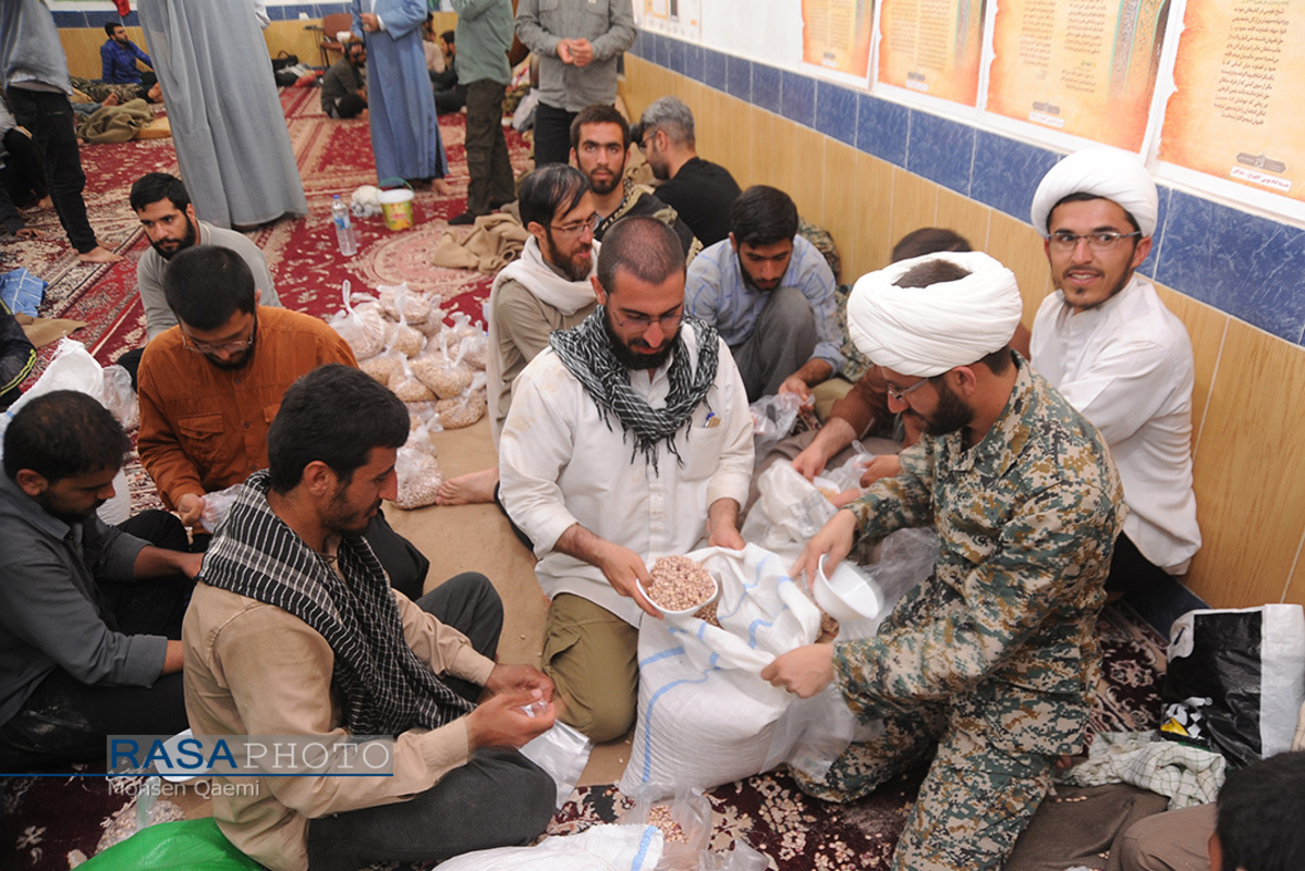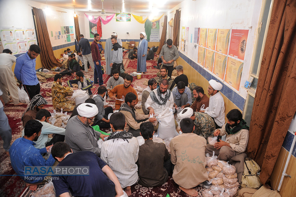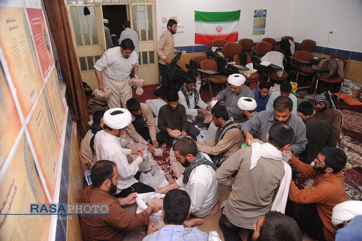 Clergy students of Imam Kazem (A.S) seminary school in Omidieh pack about one tone of groceries as flood-relief packages to deliver to people in flood-hit areas of Khuzestan