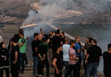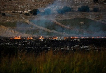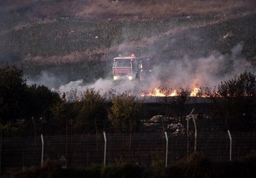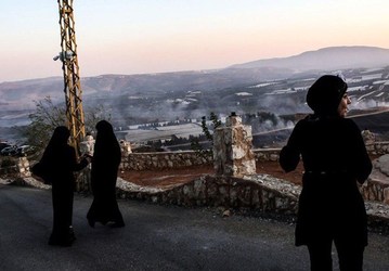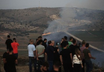 People watch as fires blaze along the Lebanese side of the border with Israel in the Lebanese village of Maroun al-Ras after Lebanese resistance movement Hezbollah targeted an Israeli military vehicle near the border with the occupied Palestinian lands.