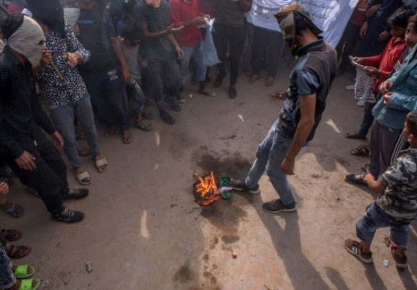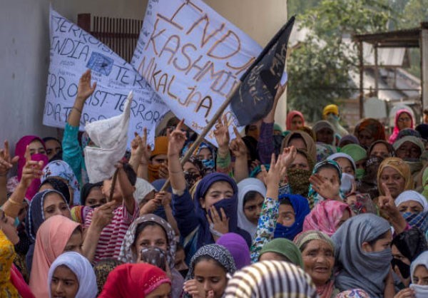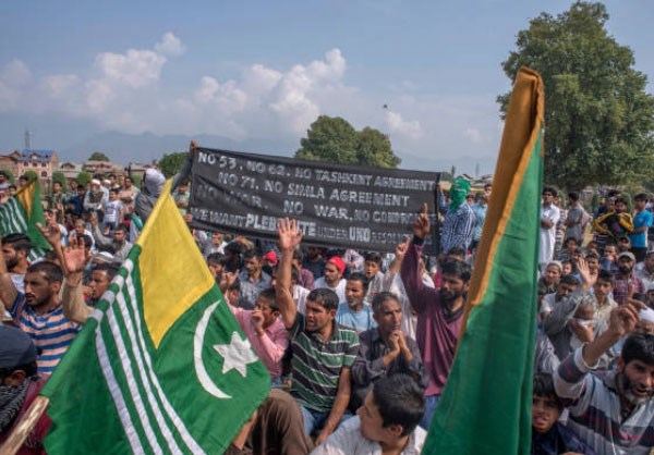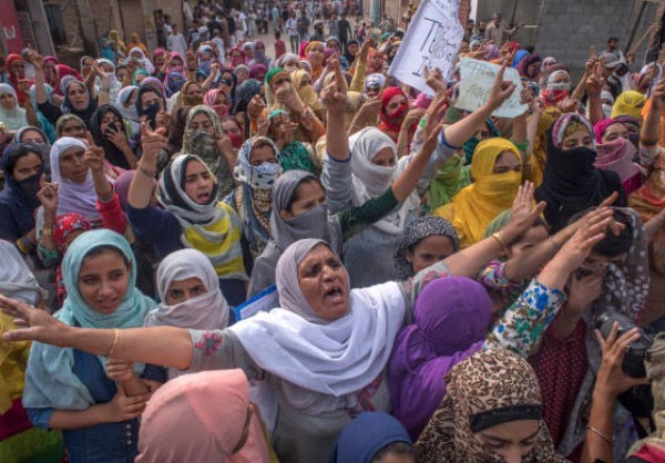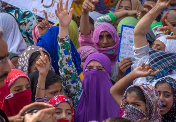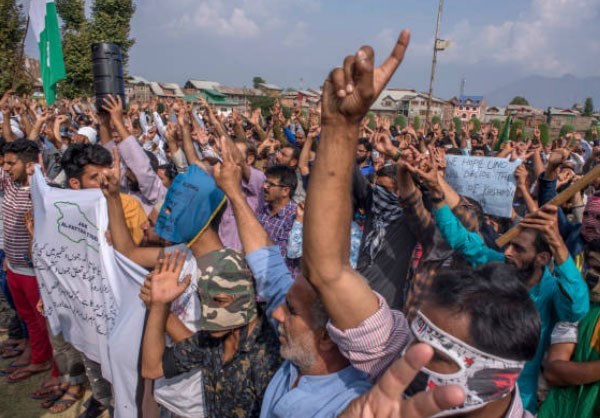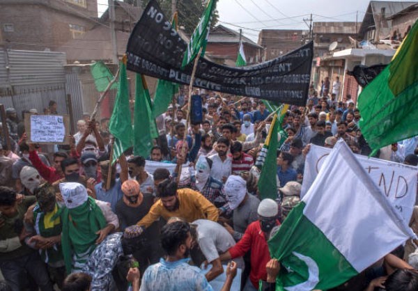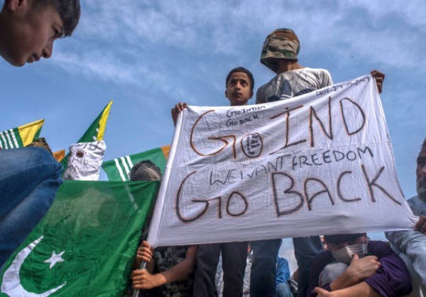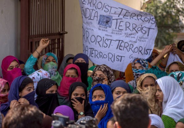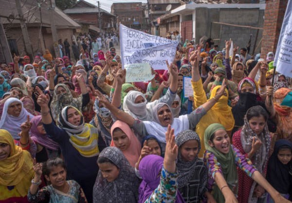 Kashmir Muslim protesters hold banners and placards during an anti India protest in the Aanchar area in Srinagar.