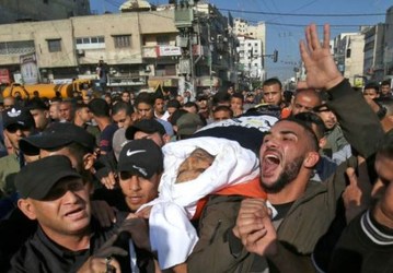 People mourn during funeral ceremony of Bahaa Abul Ata, a prominent commander in the Quds Brigades, the armed wing of Islamic Jihad Movement, who was martyred by Israeli airstrike, in Gaza City, Gaza.