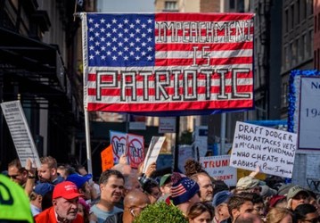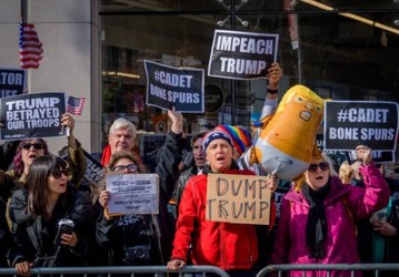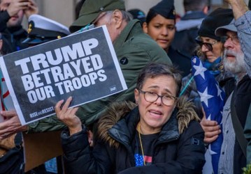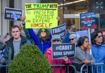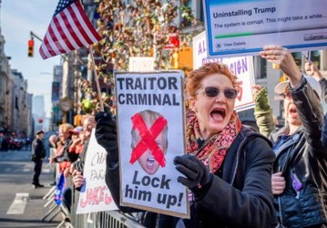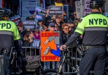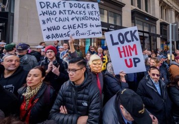 People protest against US President Donald Trump, on the sidelines of New York City's 100th Veterans Day Parade.