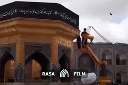برافراشته شدن بیرقهای عزا را در آستانه شهادت حضرت علی (ع) توسط خادمان حرم مطهر رضوی .