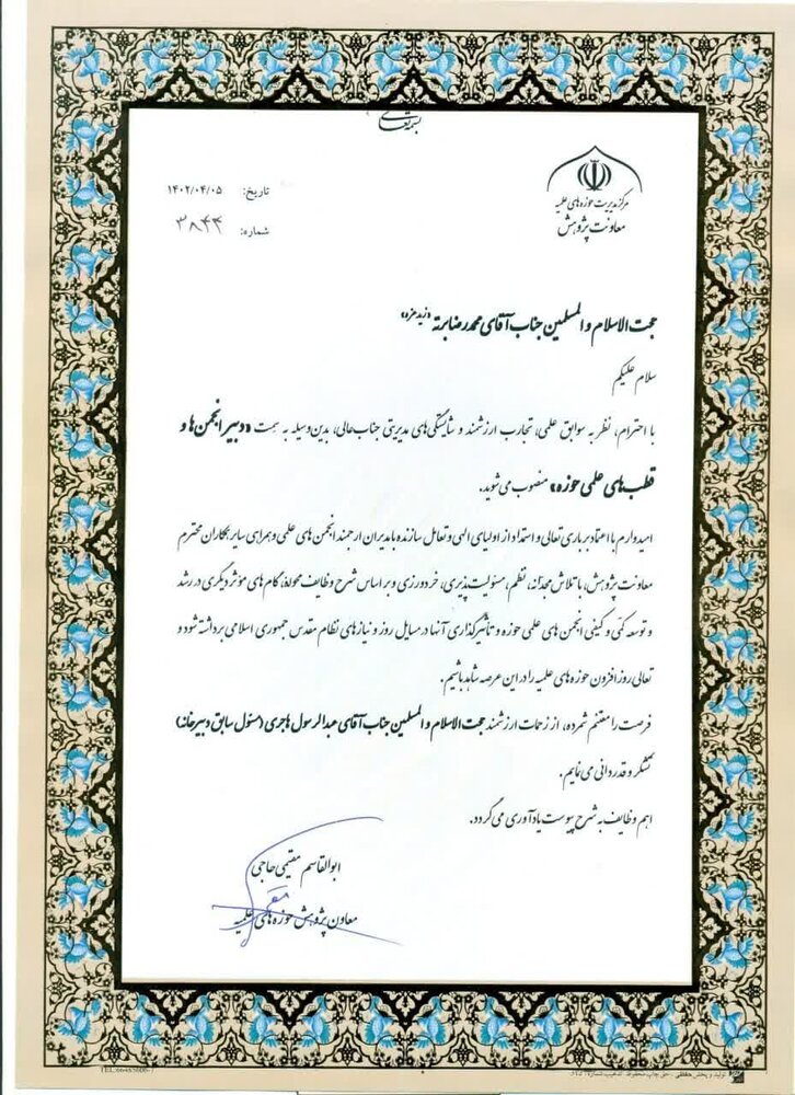 حکم معاون پژوهش حوزههای علمیه به مسئول دبیرخانه جدید انجمن ها و قطب های علمی حوزه به این شرح است: