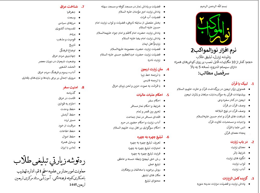 این نرم افزار حاصل همکاری معاونت امور مدارس علمیه سطح یک قم و کمیته فرهنگی، آموزشی ستاد مرکزی اربعین است که با توجه به استقبال طلاب و اساتید از این نرم افزار، در آستانه اربعین سال ۱۴۴۵ نسخ ۲ نرم افزار با تغییراتی تقدیم می گردد.