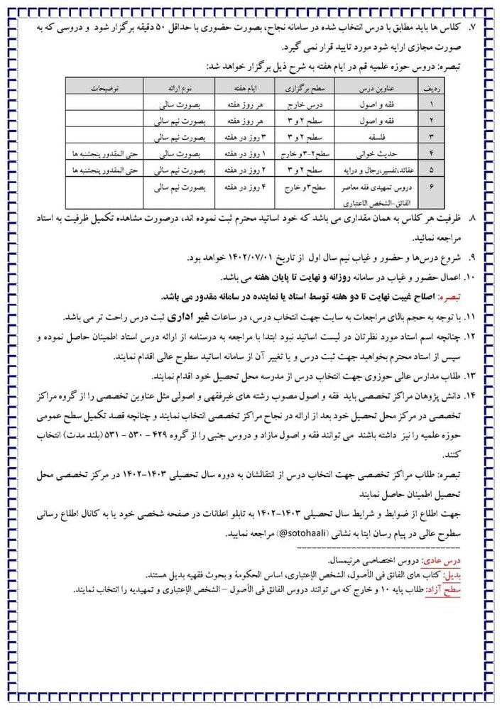 شیوهنامه انتخاب درس طرح های جاری، سابق و قدیم سطوح عالی و خارج حوزه علمیه قم سال تحصیلی ۱۴۰۳-۱۴۰۲ به شرح جدول زیر می باشد: