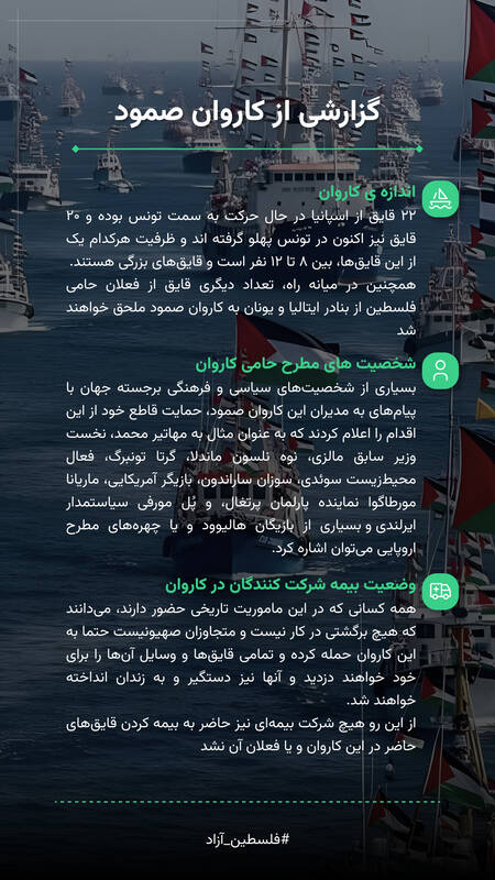 در حال حاضر ما در تونس مستقر هستیم و بخشی از اعضای کاروان نیز در حال حاضر در تونس به سر میبرند تا سایر قایقها و اعضای کاروان صمود به ما ملحق شوند. در حال حاضر ۲۲ قایق از اسپانیا در حال حرکت به سمت تونس بوده و ۲۰ قایق نیز اکنون در تونس پهلو گرفته اند و ظرفیت هرکدام یک از این قایقها، بین ۸ تا ۱۲ نفر است و قایقهای بزرگی هستند و این قایقها مجوز و تائیدیه خود به منظور حرکت و پهلوگیری در سایر بنادر در مسیر مقصد خود تا فلسطین اشغالی را گرفته اند.
