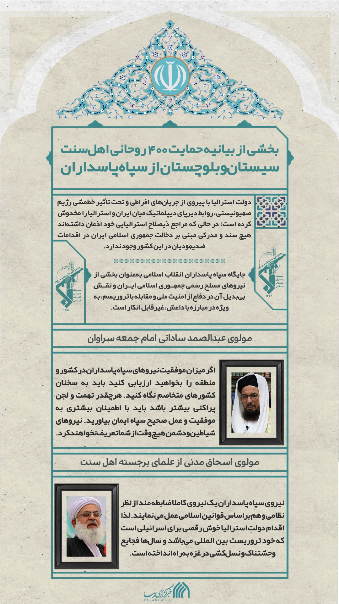 ائمه جمعه و مدرسین اهل‌سنت سیستان‌وبلوچستان اقدام دولت استرالیا در متهم‌سازی سپاه پاسداران انقلاب اسلامی را غیرقانونی دانسته و بر نقش سپاه در دفاع از امنیت ملی تأکید کردند.